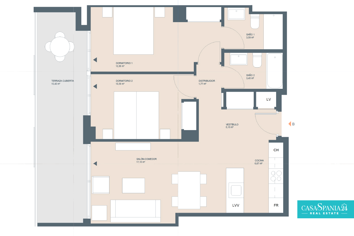 Apartament z 2 sypialniami, 2 łazienkami, kuchnią otwartą na salon i jadalnię, położony w ekskluzywnym kompleksie w Javei. Posiada zadaszony taras o powierzchni 16 m² oraz miejsce parkingowe w garażu i komórkę lokatorską.
