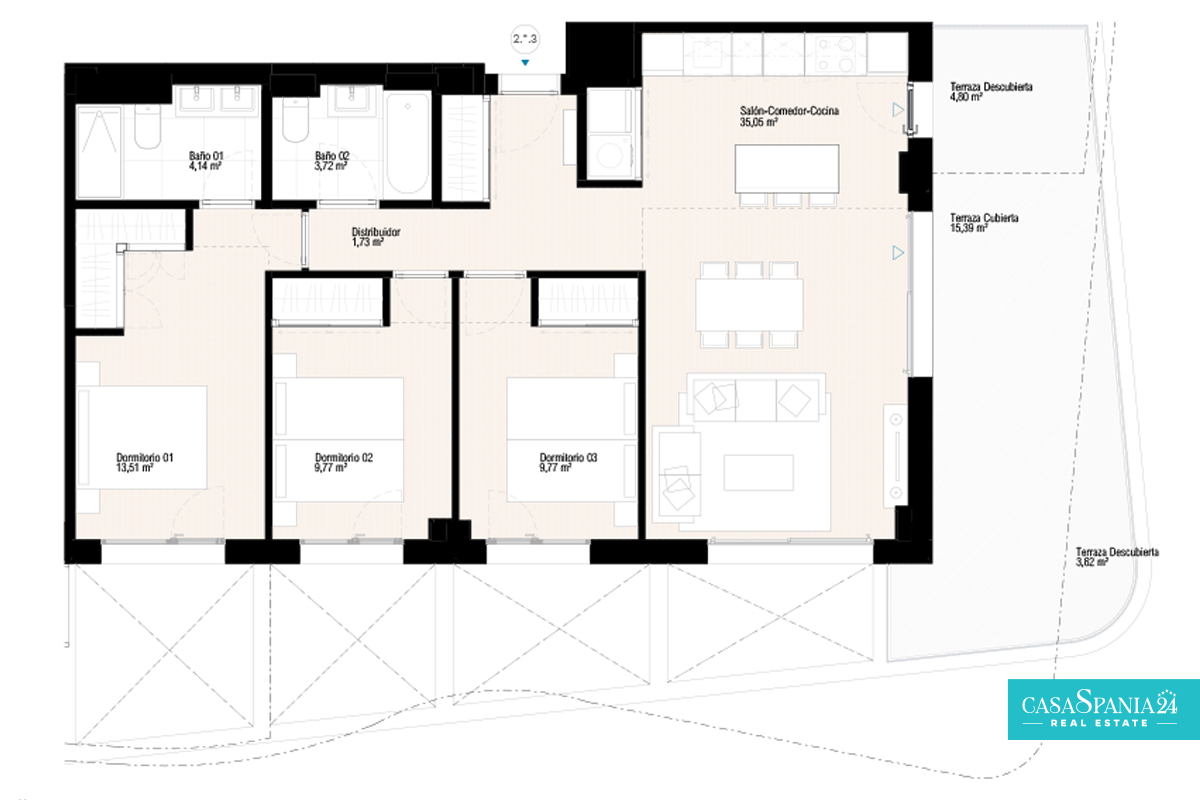 Apartament o powierzchni 133 m², składający się z 3 sypialni, 2 łazienek, salonu z otwartą kuchnią, tarasu o powierzchni 27 m², miejsca parkingowego i miejsca do przechowywania.
