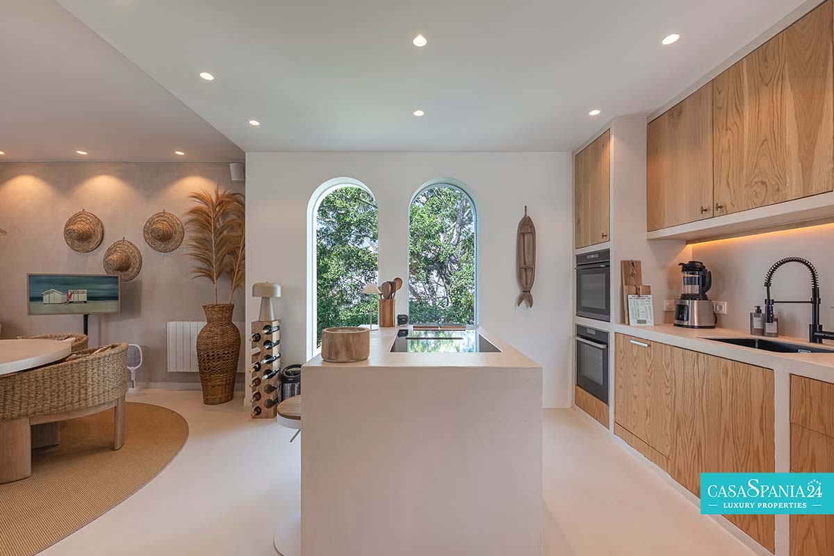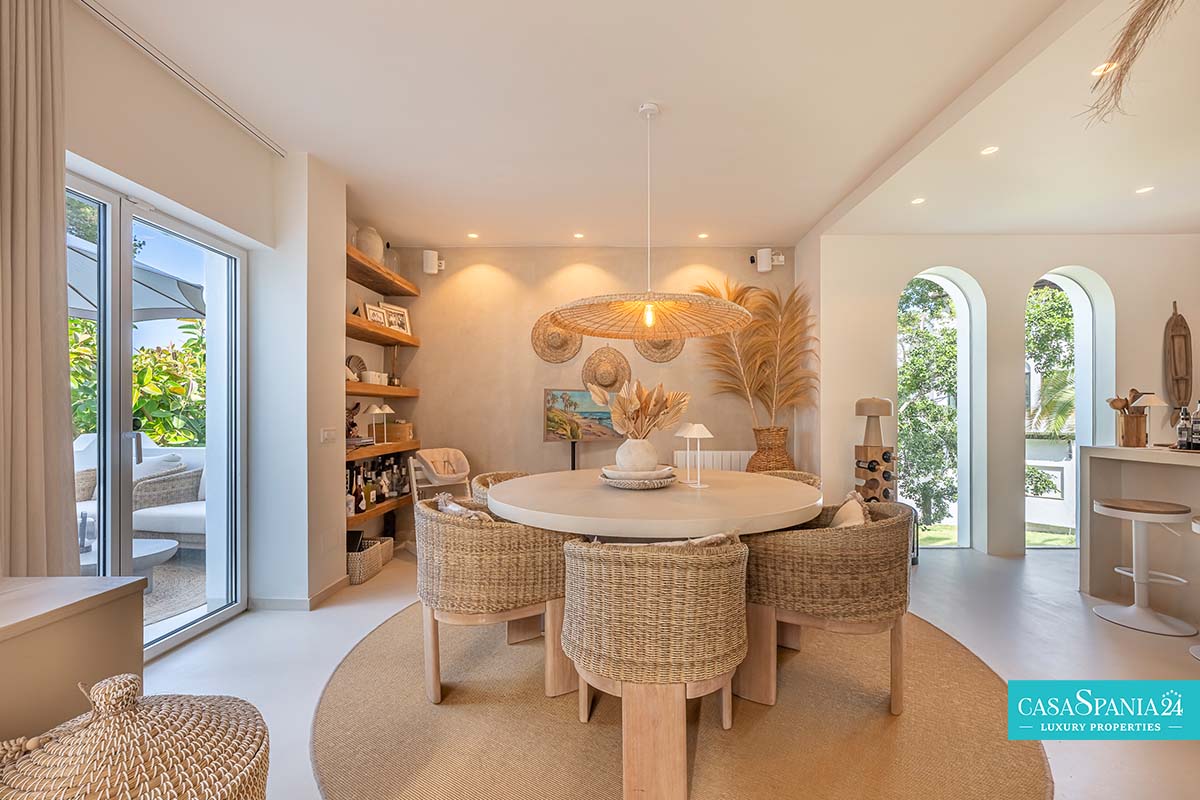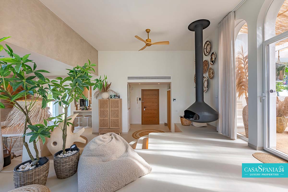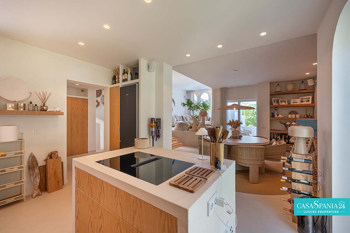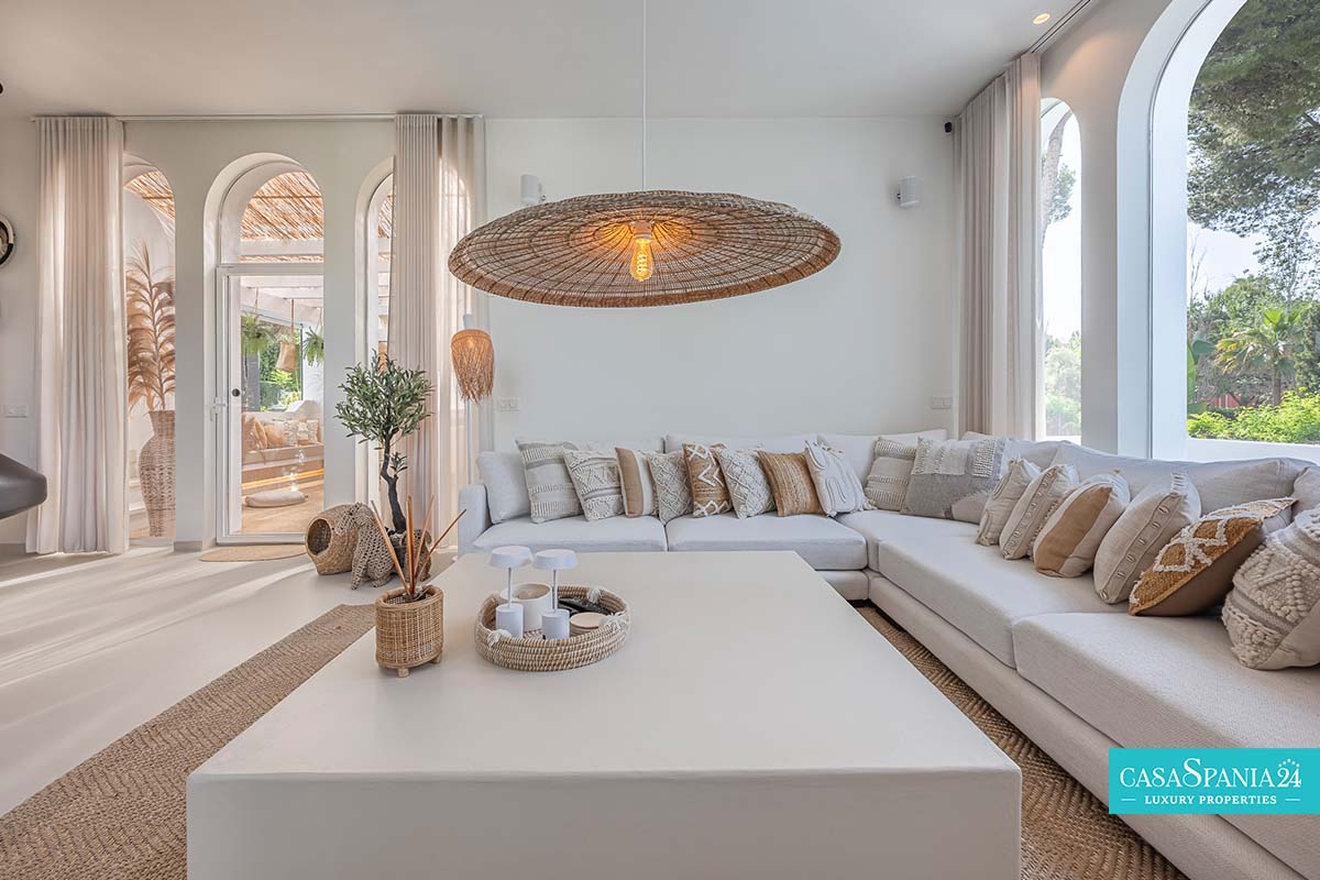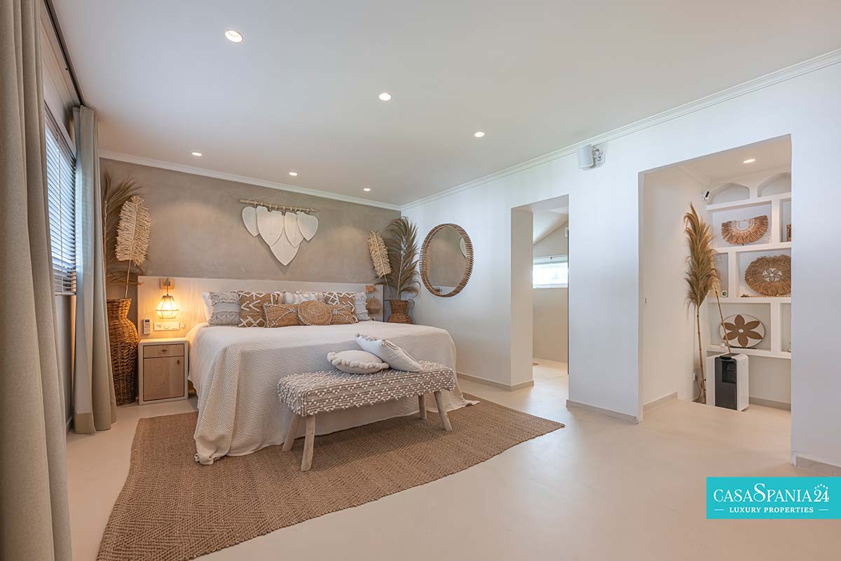 Ta wyjątkowa willa, odnowiona według najwyższych standardów w 2023 roku, charakteryzuje się wyrafinowanym, nowoczesnym stylem śródziemnomorskim z nutą ibizyjskiego stylu boho chic. Wnętrza emanują subtelną elegancją, łącząc ciepłe drewniane akcenty, eleganckie ceramiczne powierzchnie i luksusowe detale, tworząc nowoczesną, a zarazem przyjazną atmosferę.