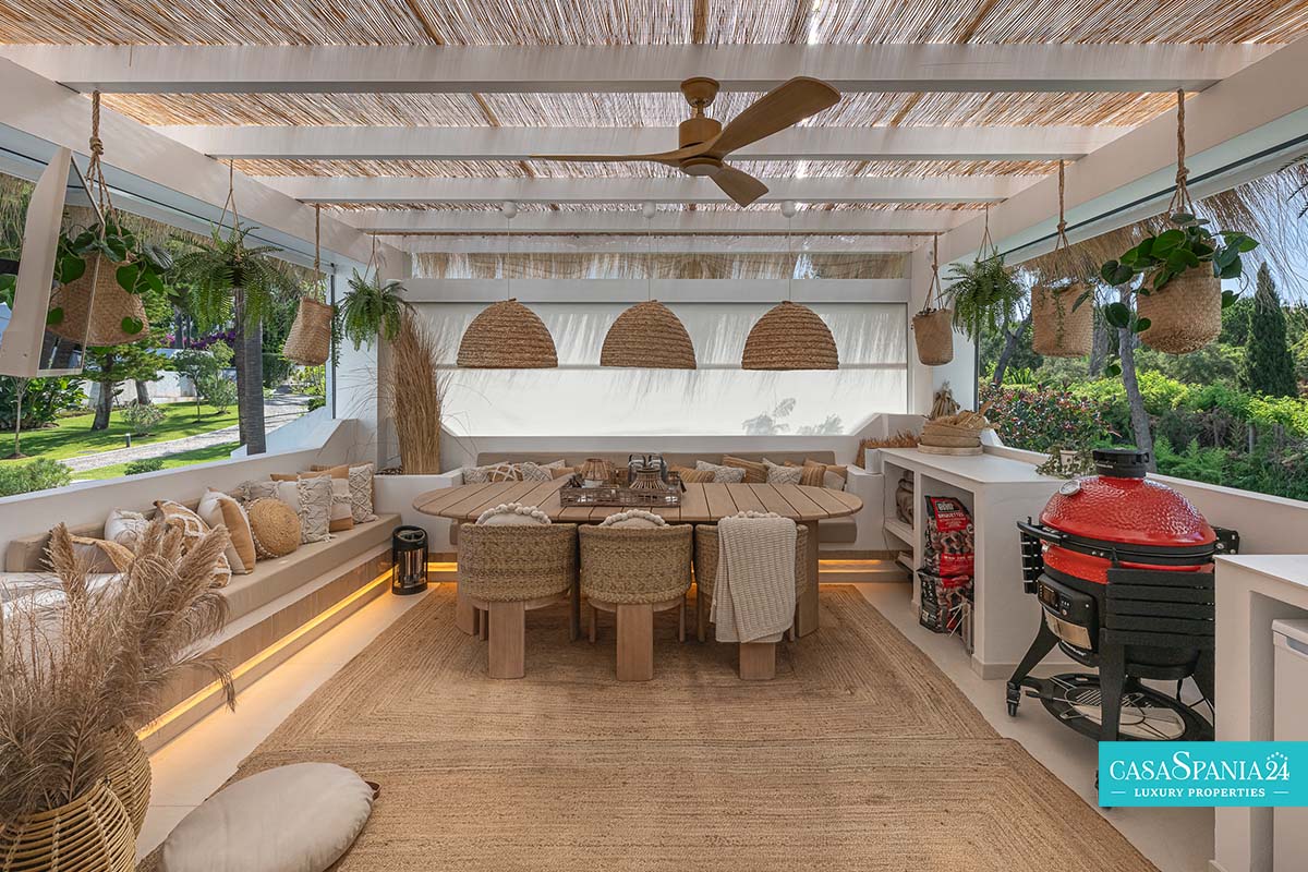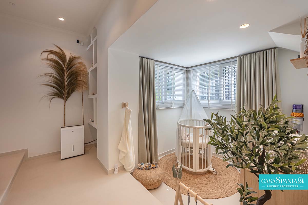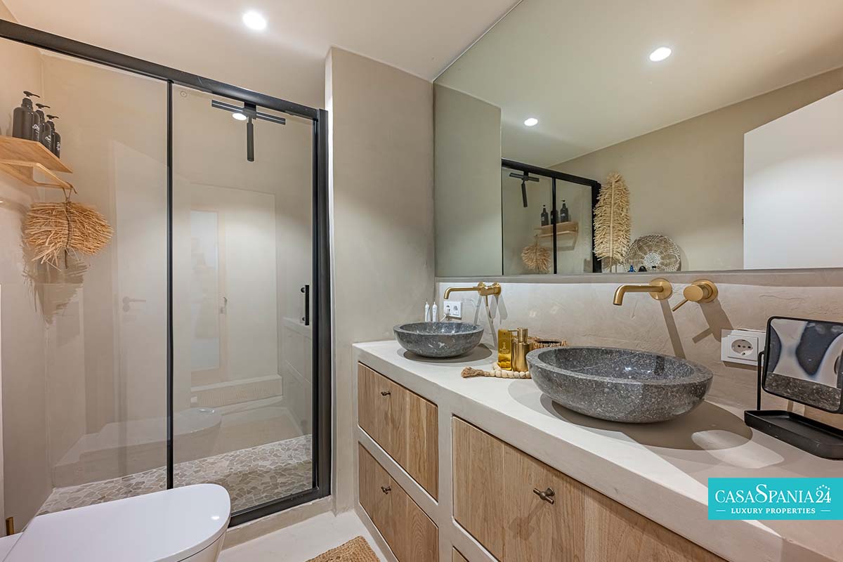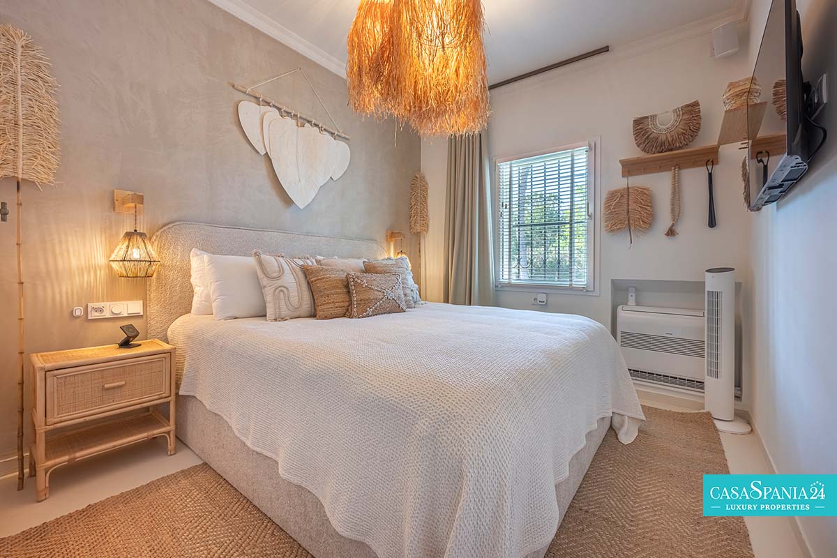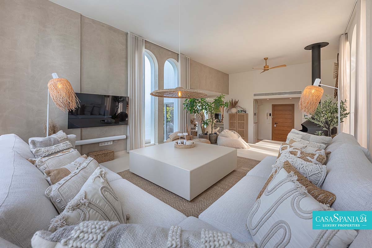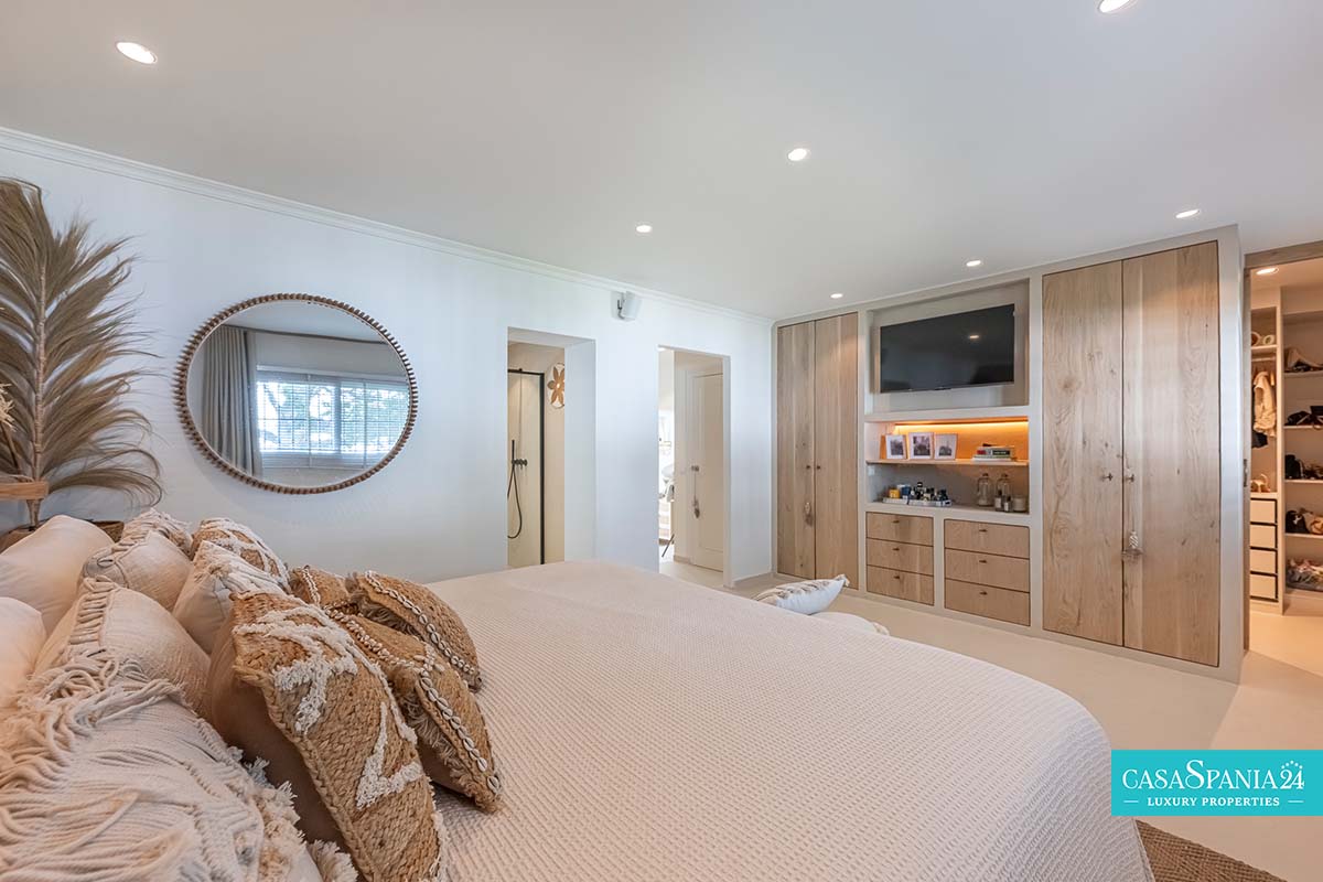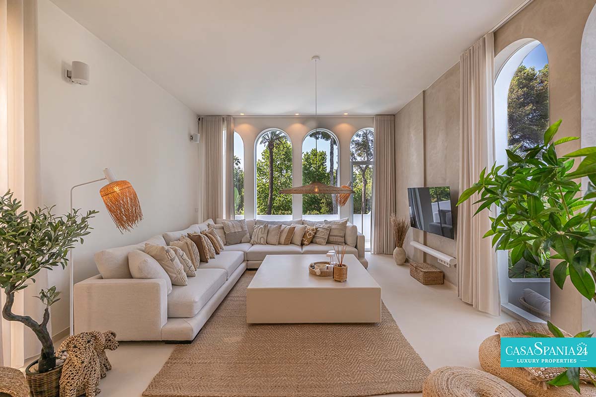Ta wyjątkowa willa, odnowiona według najwyższych standardów w 2023 roku, charakteryzuje się wyrafinowanym, nowoczesnym stylem śródziemnomorskim z nutą ibizyjskiego stylu boho chic. Wnętrza emanują subtelną elegancją, łącząc ciepłe drewniane akcenty, eleganckie ceramiczne powierzchnie i luksusowe detale, tworząc nowoczesną, a zarazem przyjazną atmosferę.
