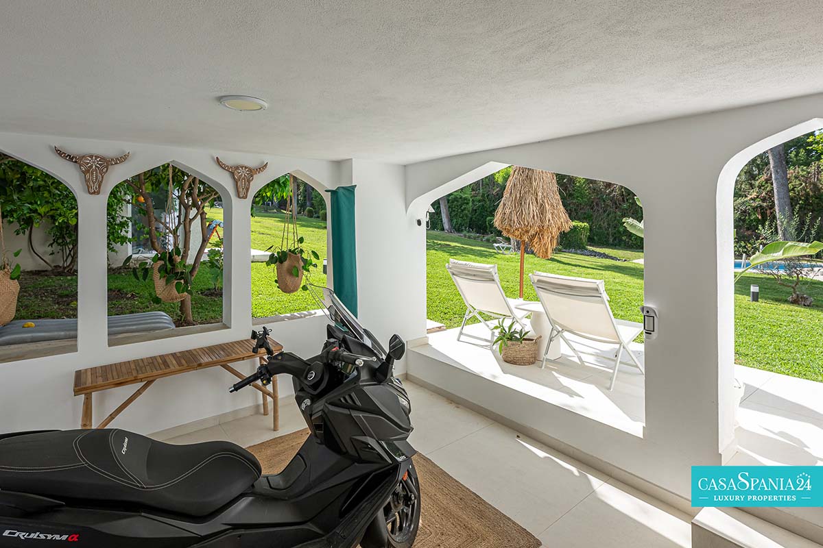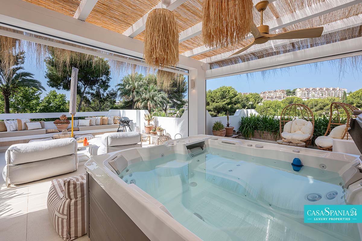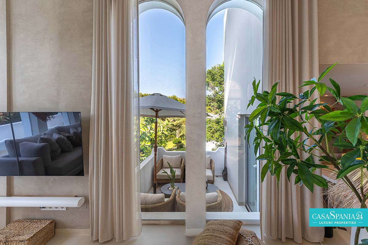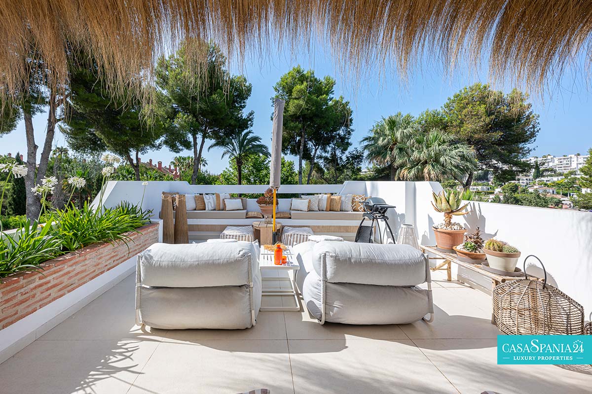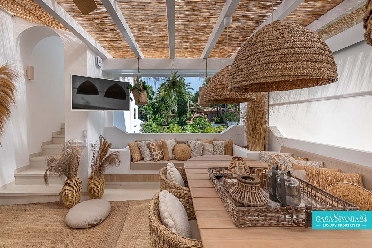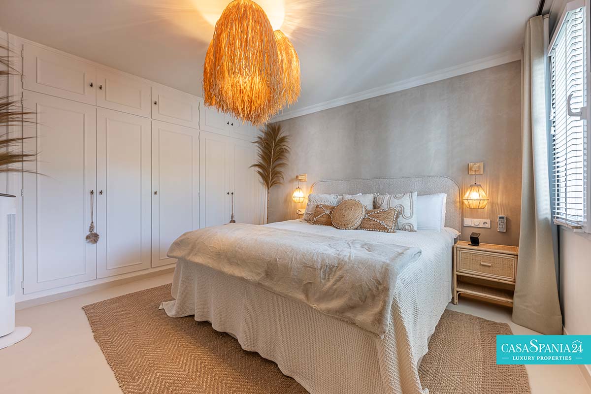Ta wyjątkowa willa, odnowiona według najwyższych standardów w 2023 roku, charakteryzuje się wyrafinowanym, nowoczesnym stylem śródziemnomorskim z nutą ibizyjskiego stylu boho chic. Wnętrza emanują subtelną elegancją, łącząc ciepłe drewniane akcenty, eleganckie ceramiczne powierzchnie i luksusowe detale, tworząc nowoczesną, a zarazem przyjazną atmosferę.
