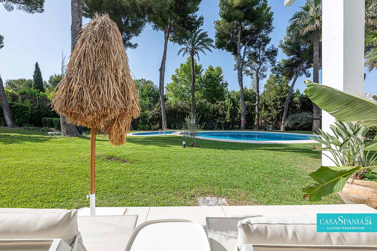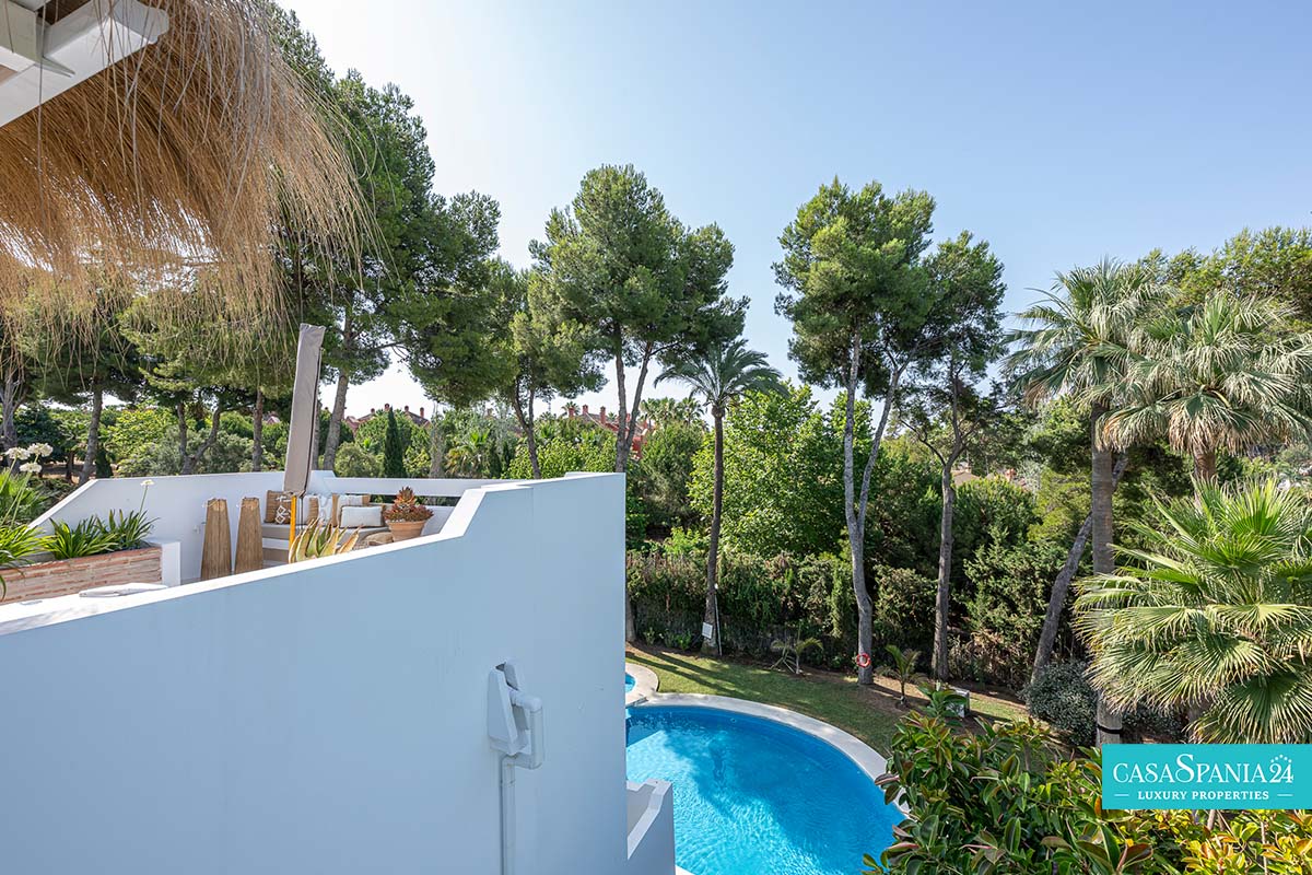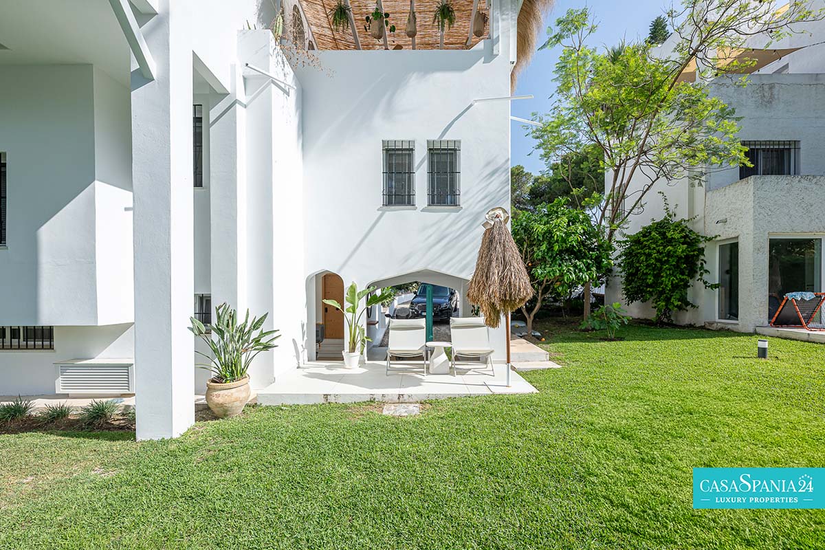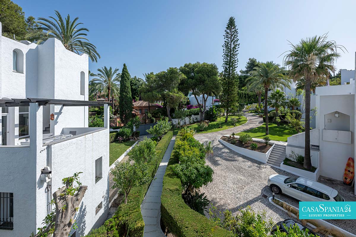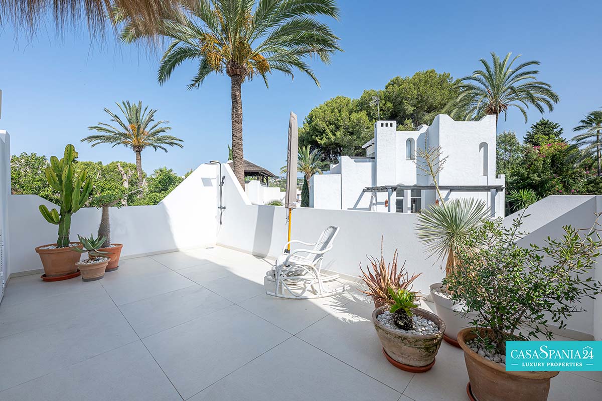 Nieruchomość wyposażona jest w moskitiery we wszystkich oknach, klimatyzację z ogrzewaniem i klimatyzacją oraz pełny system alarmowy, zapewniający bezpieczeństwo zarówno wewnątrz, jak i na zewnątrz. Zaprojektowana z myślą o relaksie i rozrywce, nieruchomość oferuje eleganckie jadalnie i miejsca do grillowania na świeżym powietrzu, a także ciche strefy relaksu. Wysokie palmy i bujna roślinność otaczają pięknie utrzymany wspólny ogród z dwoma basenami. Ten dom to nie tylko rezydencja, ale prawdziwa oaza stylu życia, łącząca architektoniczną finezję z naturalnym śródziemnomorskim urokiem.