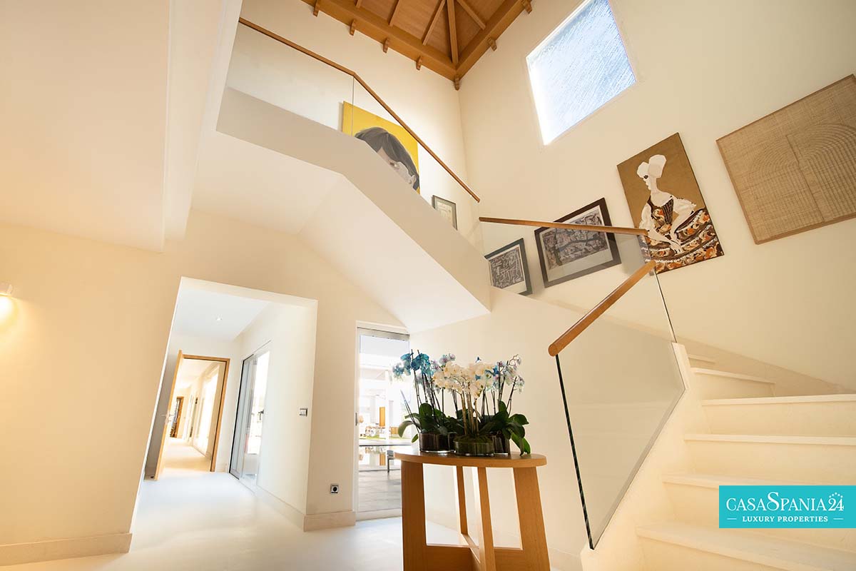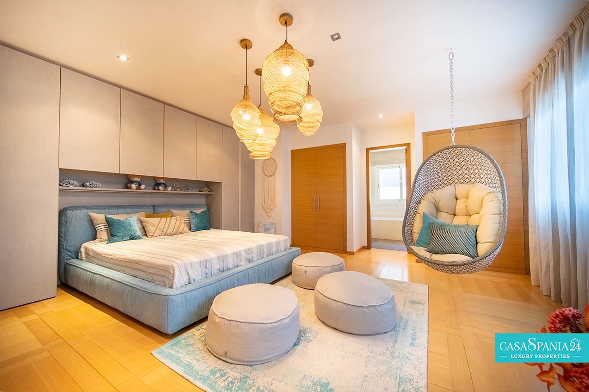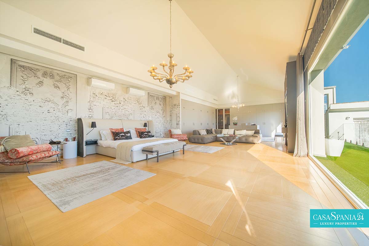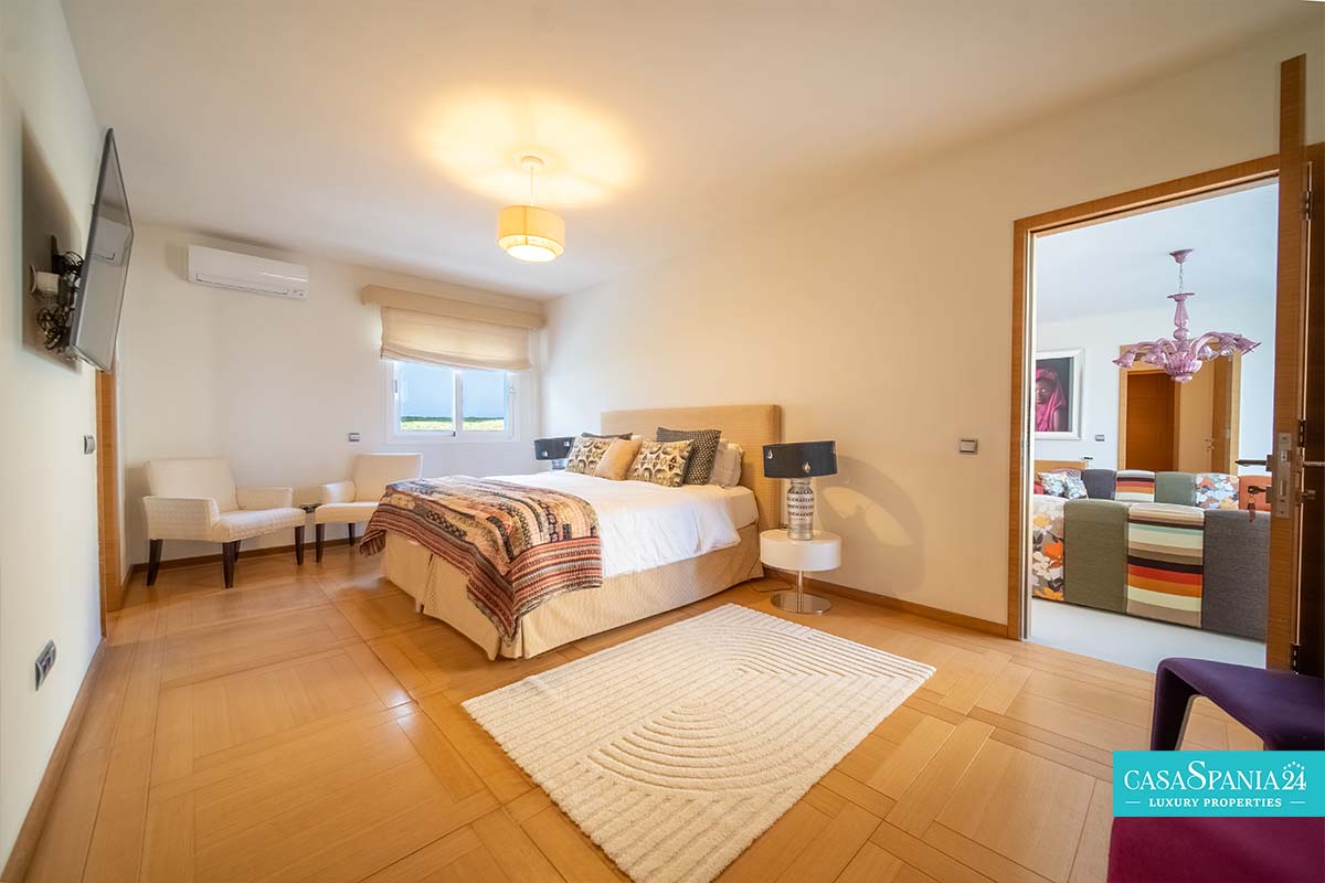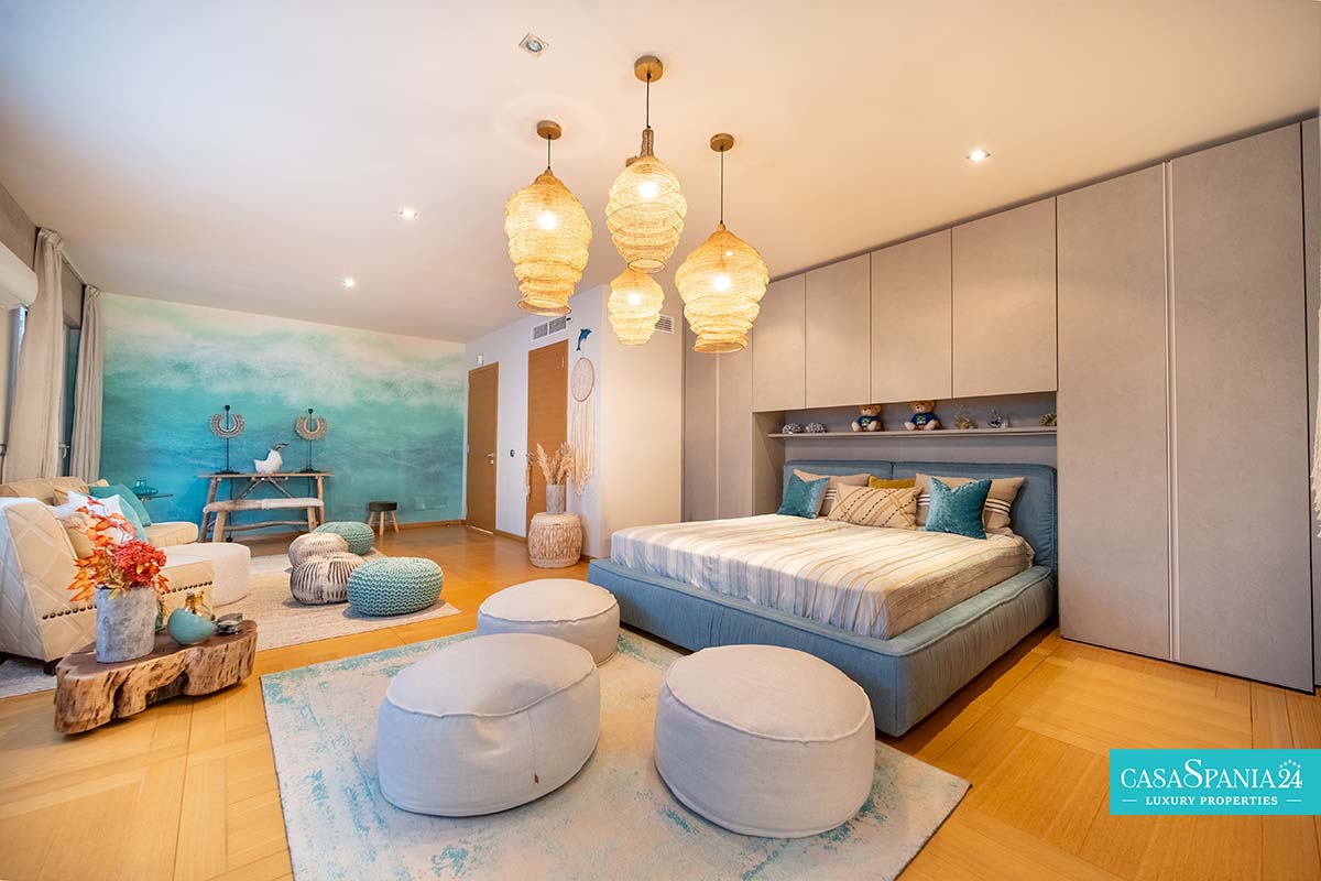 Po prawej stronie od wejścia znajduje się apartament gościnny, położony obok głównego domu rodzinnego, a także kolejna sypialnia z łazienką, którą można wykorzystać jako kącik zabaw lub gabinet, a także pralnia, dostępna po spiralnych schodach lub z parteru. Po lewej stronie od wejścia znajdują się cztery kolejne sypialnie z łazienkami, w tym jedna wyposażona w projektor i wyjście na taras, obecnie zaadaptowany na plac zabaw dla dzieci. Na piętrze znajduje się cały apartament główny, który obejmuje prywatny salon, garderobę, łazienkę oraz prywatny taras z jacuzzi, z którego roztacza się wspaniały widok na morze.