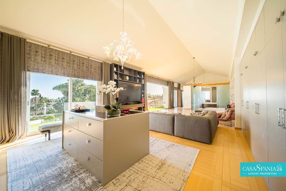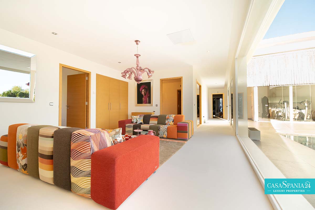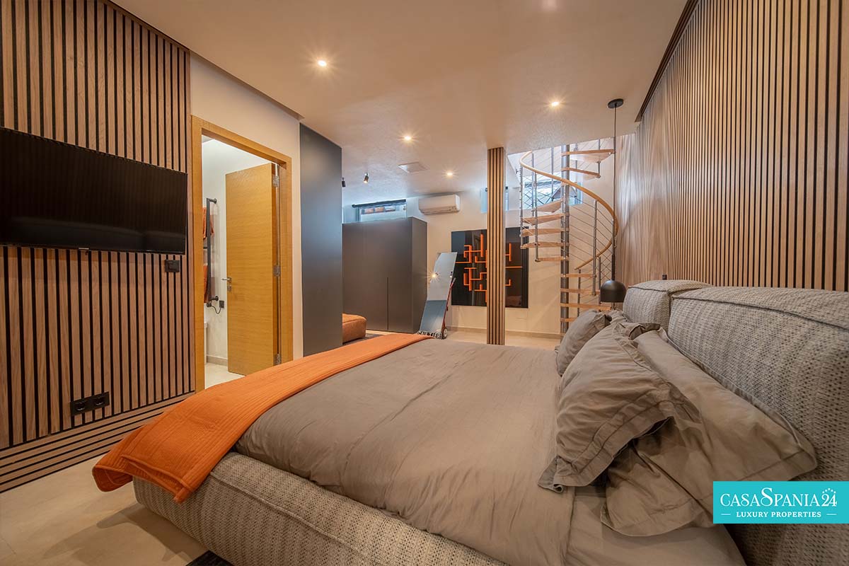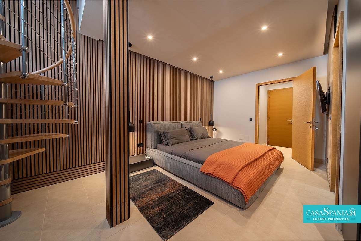 Po prawej stronie od wejścia znajduje się apartament gościnny, położony obok głównego domu rodzinnego, a także kolejna sypialnia z łazienką, którą można wykorzystać jako kącik zabaw lub gabinet, a także pralnia, dostępna po spiralnych schodach lub z parteru. Po lewej stronie od wejścia znajdują się cztery kolejne sypialnie z łazienkami, w tym jedna wyposażona w projektor i wyjście na taras, obecnie zaadaptowany na plac zabaw dla dzieci. Na piętrze znajduje się cały apartament główny, który obejmuje prywatny salon, garderobę, łazienkę oraz prywatny taras z jacuzzi, z którego roztacza się wspaniały widok na morze.