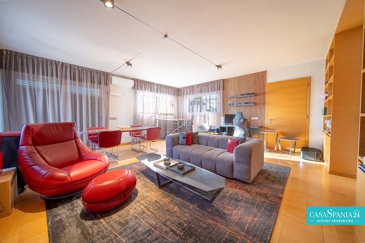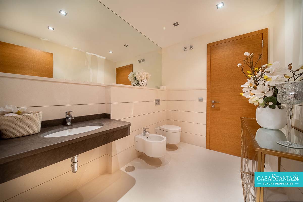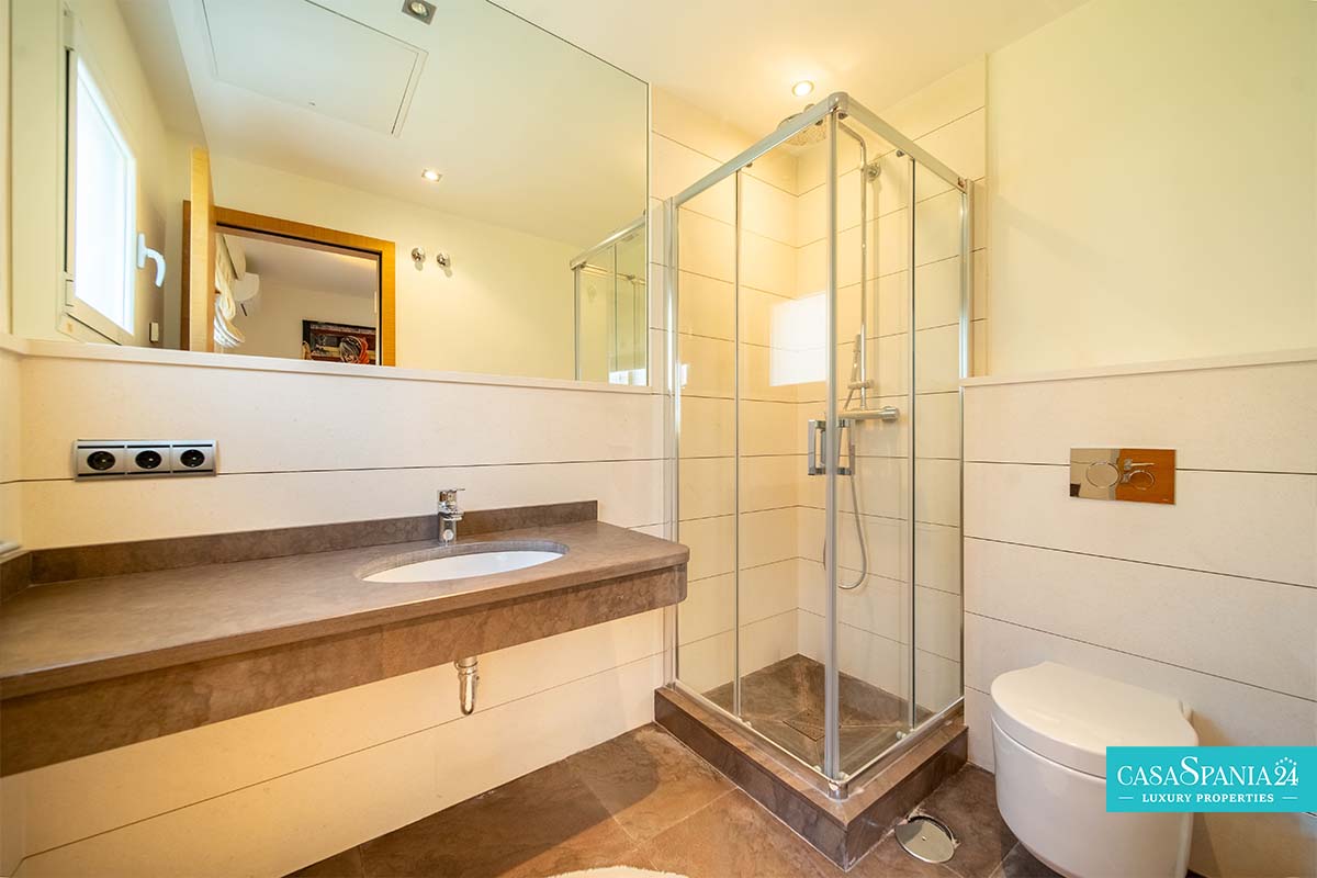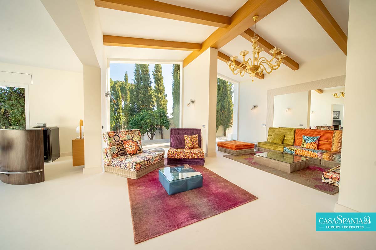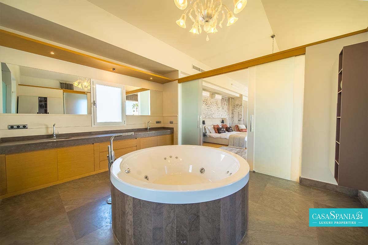 Po prawej stronie od wejścia znajduje się apartament gościnny, położony obok głównego domu rodzinnego, a także kolejna sypialnia z łazienką, którą można wykorzystać jako kącik zabaw lub gabinet, a także pralnia, dostępna po spiralnych schodach lub z parteru. Po lewej stronie od wejścia znajdują się cztery kolejne sypialnie z łazienkami, w tym jedna wyposażona w projektor i wyjście na taras, obecnie zaadaptowany na plac zabaw dla dzieci. Na piętrze znajduje się cały apartament główny, który obejmuje prywatny salon, garderobę, łazienkę oraz prywatny taras z jacuzzi, z którego roztacza się wspaniały widok na morze.