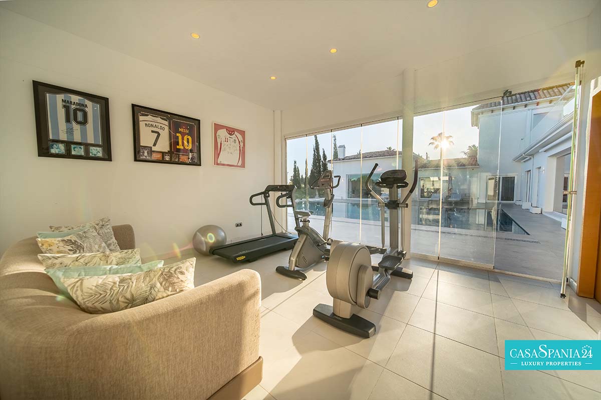 W pełni wyposażona siłownia i łazienka z prysznicem znajdują się obok strefy rekreacyjnej, z bezpośrednim dostępem z basenu i tarasu. Willa posiada garaż na kilka samochodów oraz dodatkowy parking terenowy. Otaczający ogród jest idealny dla dzieci, oferując przestrzeń do zabawy i organizacji imprez na świeżym powietrzu.